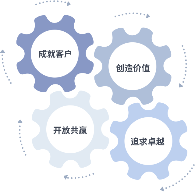 成就客户是一切决策的出发点,创造价值是衡量所有工作的标准,追求卓越是777盛世国际做事做人的态度,开放共赢是777盛世国际的格局也是最终的结果。价值观的齿轮环环相扣,推动着组织里的每个人不断向前。